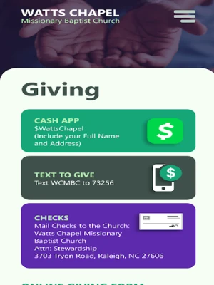 The official app of Watts Chapel Missionary Baptist Church. Watts Chapel is located in Raleigh, North Carolina and is led by Reverend Doctor Harry L. White, Jr.
